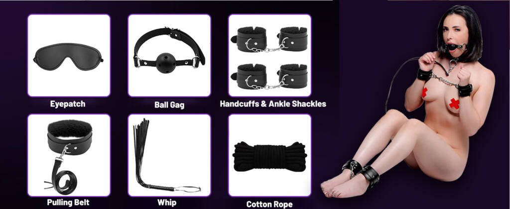 - 1. BDSM Kit: Start your journey with this complete 7-piece bondage set, featuring all the essentials: adjustable handcuffs, ankle cuffs, a collar, blindfold, ball gag, flogger, and ropes. Perfect for couples new to bondage toys and BDSM exploration.